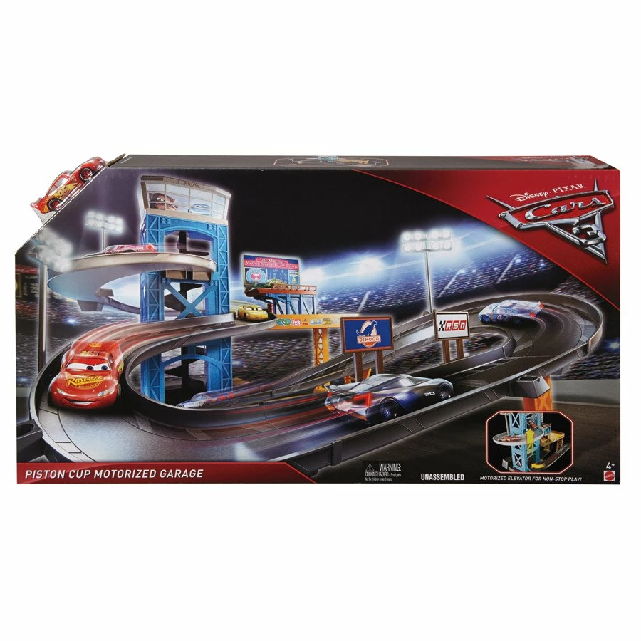The Piston Cup Motorized Garage by Mattel is a playset for Disney Pixar Cars movie fans. This garage is inspired by the Cars 3 movie. The garage has 3 levels of tracks and a working elevator which transports the cars to the top. There is a pit stop area and a parking garage on different levels and floodlights placed on other parts of the track. You will find popular stickers from racing events of the car movie, including Dinoco in the box. There is a scoreboard on the second level. It comes unassembled in the box with instructions to put the motorized garage together. Adult supervision and help will be required to assemble the playset. It includes one car, Lightning McQueen from the Cars movie. You can use any other Mattel cars on this garage. Kids can use the elevator to bring the car up to the top level and then see them race down the tracks. This playset is recommended for children over 4 years old. It is made of plastic and requires 2 D batteries.