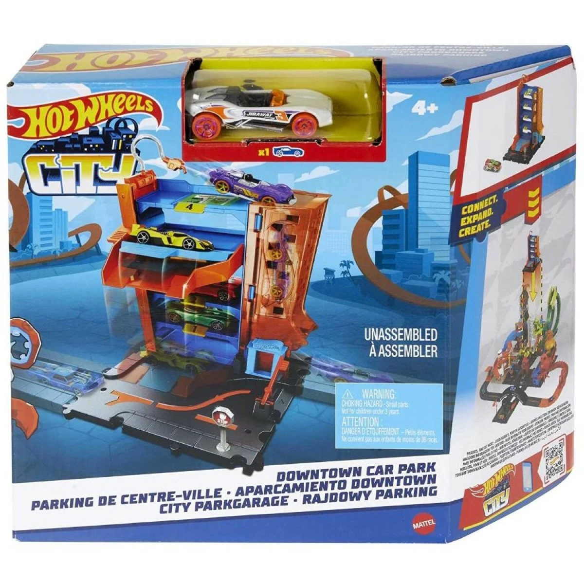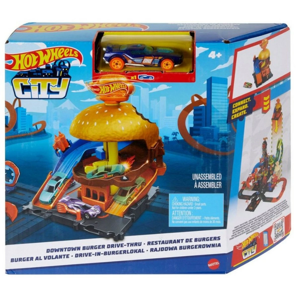 Kids may design their own urban environment filled with fascinating adventures and daring stunts using the Hot Wheels City Downtown Assortment. Each set incorporates components that indicate a creature might be hiding nearby, ready to pounce, in line with the Hot Wheels City enemy theme. Each one includes a Hot Wheels vehicle for push-around play right out of the box and connects to other Hot Wheels sets (each sold separately) via several connection points. Kids will want to collect all of the classic settings, like a repair shop, a drive-through burger restaurant, a vehicle wash, and a parking garage, for their limitless story possibilities. Each is sold separately. You can construct the ideal cityscape with each iconic site and nemesis creature-themed Hot Wheels City Downtown sets. The excitement takes place here! The kit includes one of the following: a repair shop, burger drive-through, car wash, and parking garage that can be connected to other Hot Wheels sets and one another.