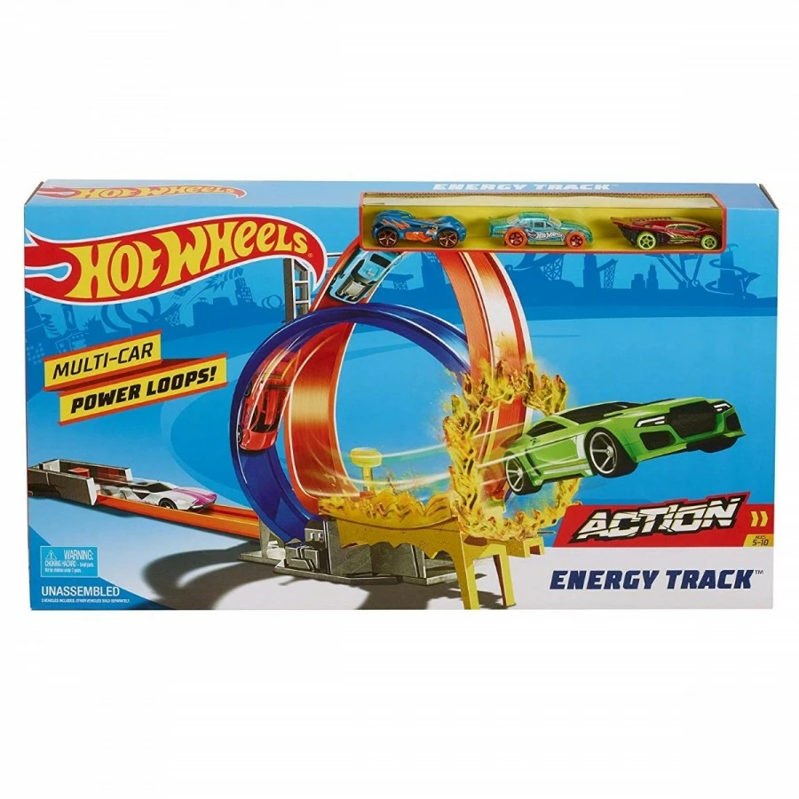 Build this set to create your exciting race track. The package contains 3 die-cast Hot Wheels cars and the parts to build the ultimate race track. The Hot Wheels Energy Track Set is straightforward to assemble and will only take a couple of minutes. The fun starts with sorting the pieces and connecting them. Once fully assembled, take your cars and place them one by one on the launcher. Watch as the cars zoom through the double loops that turn the cars upside down. Once the cars have passed the loops, the next part is the ring of fire. There are three cars, but only one of them wins the race. Finishing one race does not mean you should stop the fun. You can do it over and over again. There is no time limit. You can do a race again, or you can choose to do a time challenge. Practice every day to beat your record. This item is recommended for kids aged 5+.