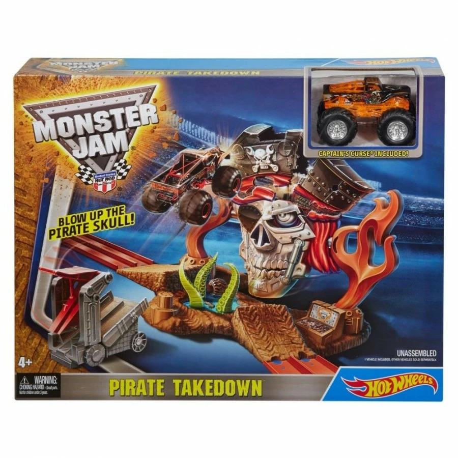 Get ready to take down a notorious pirate with a monster truck! This Hot Wheels Monster Jam Captains Curse Playset is a monster truck stunt play set to ësinkí a pirate set using the fabulous “Captainís Curse” monster truck by putting the truck on a launcher and then launch it to hit the pirate ship, which will reveal the skull head of a notorious pirate. Relaunch the Captainís Curse truck at the pirateís head to blow up the pirate and claim the hidden treasure chest loot. The challenge to succeed is to know how much pressure to apply in the launch of the Captainís Curse truck and to aim the launcher correctly, but success will bring its rewards. This challenge will keep your child happy playing it for hours. This playset can be combined and joined with other Hot Wheels Monster Jam playset, sold separately. It needs some prior assembling before playing. Suitable for ages 4 years to 10.