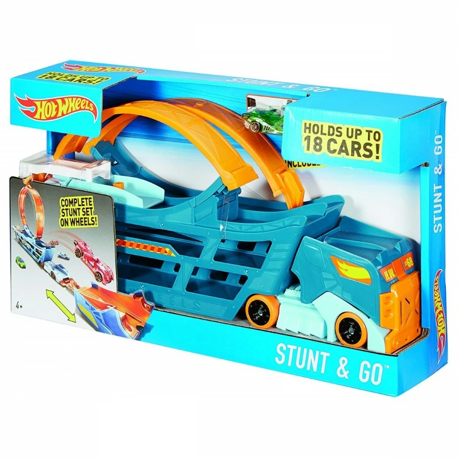 Check out the Hot Wheels Stunt N Go Hauler truck, which is described as “Complete Stunt Set with Wheels!”. This playset comes with 1 Hot Wheels car, and the box stated that it could hold up to 18 Hot Wheels cars, which are sold separately. In the Hauler Truck mode for transporting or when not being played as a stunt track, it can store or transport up to 18 Hot Wheels cars. Transform the Hauler truck by unfolding its driver’s cab and pull it out where there is a retractable track attached to it, and this unfolded cab will become the stunt car catcher. Flip out and connect the 2 semi-circle tracks, folded into the Hauler truck to make a complete 360? loop track and attach the Hot Wheels sign at the top of this loop track. Flip out the back part and unfold it into the launcher. Put a car on the launcher and launch it to see how far each different car can jump. Suitable for ages 5 and up.