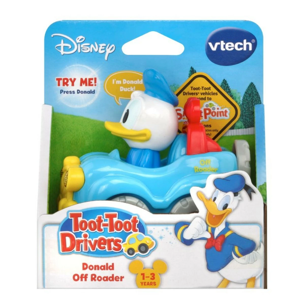 See your favourite Disney characters riding their cute vehicles with VTech Toot-Toot Drivers. There are six vehicles to collect, and there’s Mickey in his red convertible or orange off-roader. Goofy is looking cool in his green tow truck. Daisy is so stylish in her purple convertible. There’s also Donald Duck who is very cute riding his blue off-roader. You can also get Minnie in her pink convertible. These Toot-toot vehicles can be played with all Toot-toot Drivers sets and respond to SmartPoint locations. That is not the only cool feature. When you push the characters down on their seats, you will hear them speak and sing songs. Each vehicle plays three fun songs that children can sing and dance along to. Pushing the characters also turns on the headlights of the vehicles. Check our website for available Toot-toot Drivers Track sets that you can pair up with these Disney vehicles. These toys are recommended for boys and girls aged 1-3 years. All items are sold separately and subject to availability.
